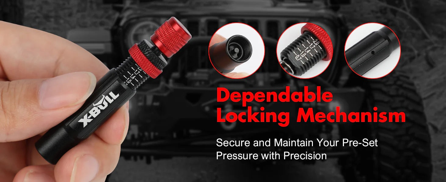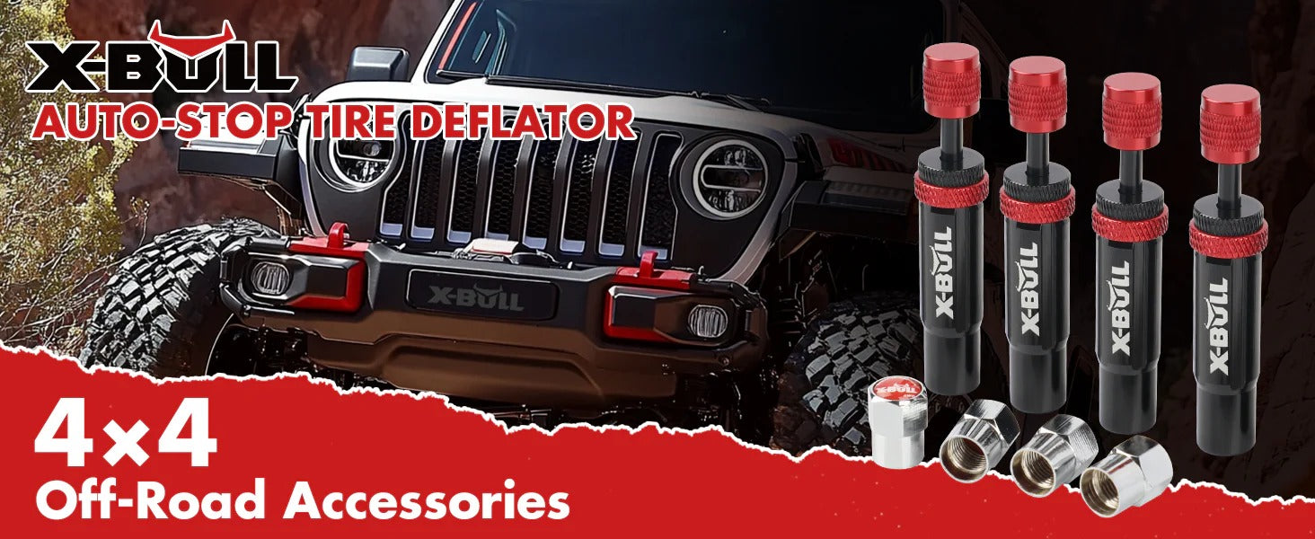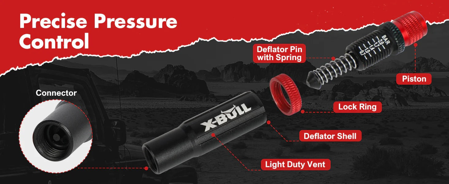 - Desinflado eficiente y parada automática: este kit ofrece un desinflado rápido de los neumáticos con una función de parada automática incorporada, y solo requiere un giro de la carcasa del deflador, asegurando una presión precisa de los neumáticos cada vez sin intervención manual, libera tus rodillas y espalda.