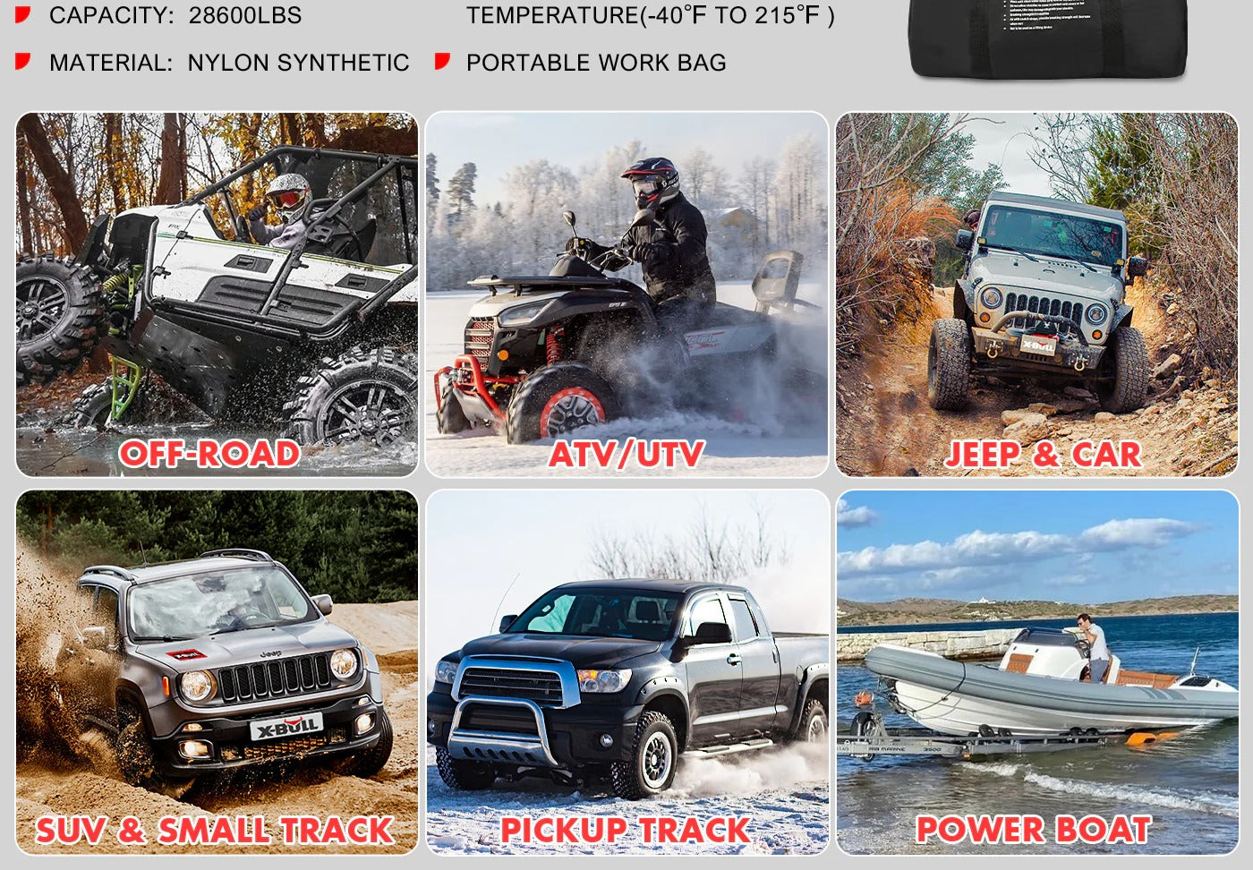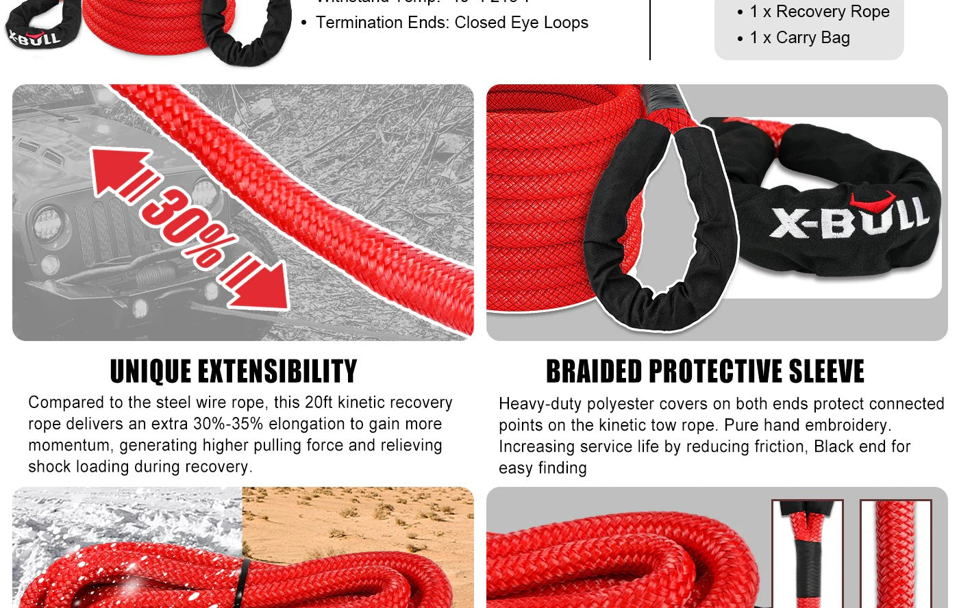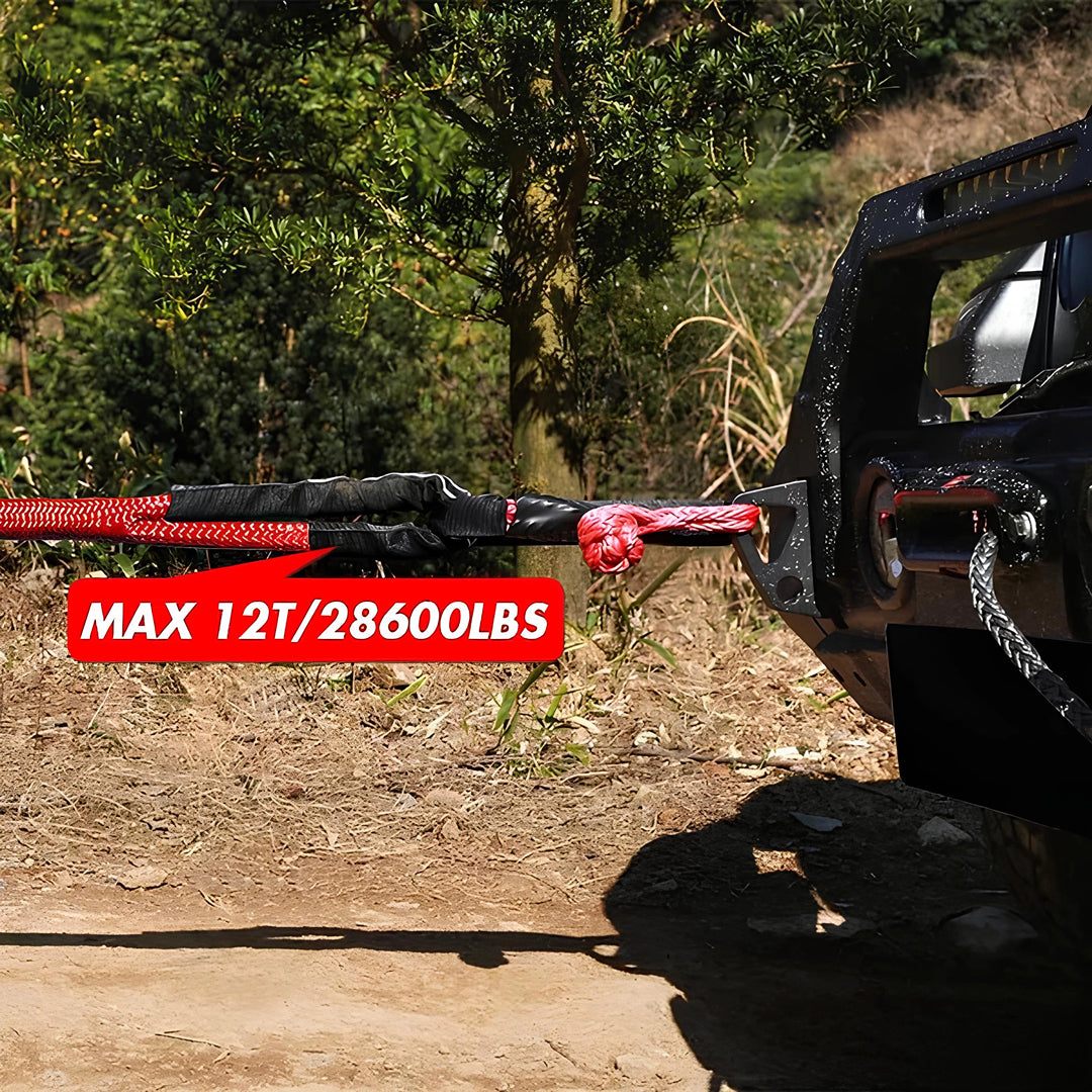 que está hecha de nailon 66 de doble trenzado, un semicristalino resistente a la tracción y la flexión, esta cuerda de recuperación de energía cinética X-Bull de 9 metros tiene una capacidad de trabajo de 12776 kg, lo que permite tirar fácilmente de la mayoría de los 4x4 y Jeeps que desee sin pensarlo dos veces. En comparación con las cuerdas de remolque, esta cuerda de remolque de 9 metros es altamente resistente a la tracción y puede proporcionar un 30 % más de elasticidad, lo que a su vez se traduce en una mayor fuerza de tracción para sacar su vehículo varado de terrenos sueltos, como nieve, arena o barro, ¡con un impacto mínimo!